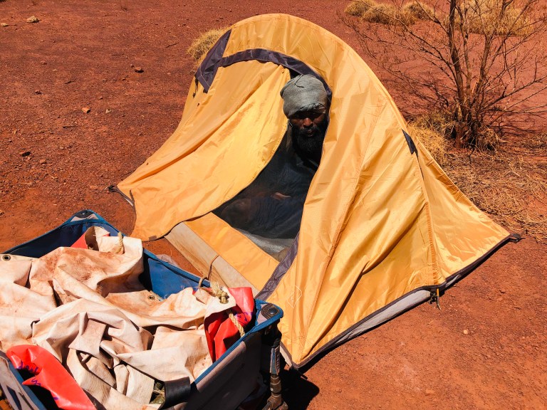 He looked at me with a look that made the air and where we were go quiet were i could hear the crickets in the back ground so clearly and like life just stoped for that split minute. He looked at me with a smile i’ll except this offer but only through you, with the power of knuckles i agreed, it was a feeling of goodness, and a bit over whelming that this strange little man excepted my offer but no one else’s.. i don’t feel like God or any thing i just felt good that myself and all the crew involved could give this guy with such strong belief that God had asked him to walk in to the harsh but beautiful country that people die in there cars when lost on the road or tracks with there adventure of the Pilbara.