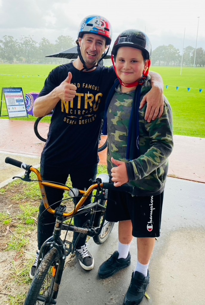 As Terry and i were catching up and watching 50 kids and i must say adults as well riding on the track, Todd comes over to say hello to dad he’s in Perth for a while to catch up with family, we got chatting realised who i was and asked why are you here, pointed out my grandson and bang he was there riding with Kado and the othere’s, as you could imagine the kids were in ore as they all know there BMX stars of the world, It was brilliant as i watched Kado interact with a super star of the world in sports, i could not but notice how humble and great Todd was with all the kids and the commotion around him, if you met him on the street and didn’t know who he was you would walk away thinking what a really nice guy and so genuine with life.
