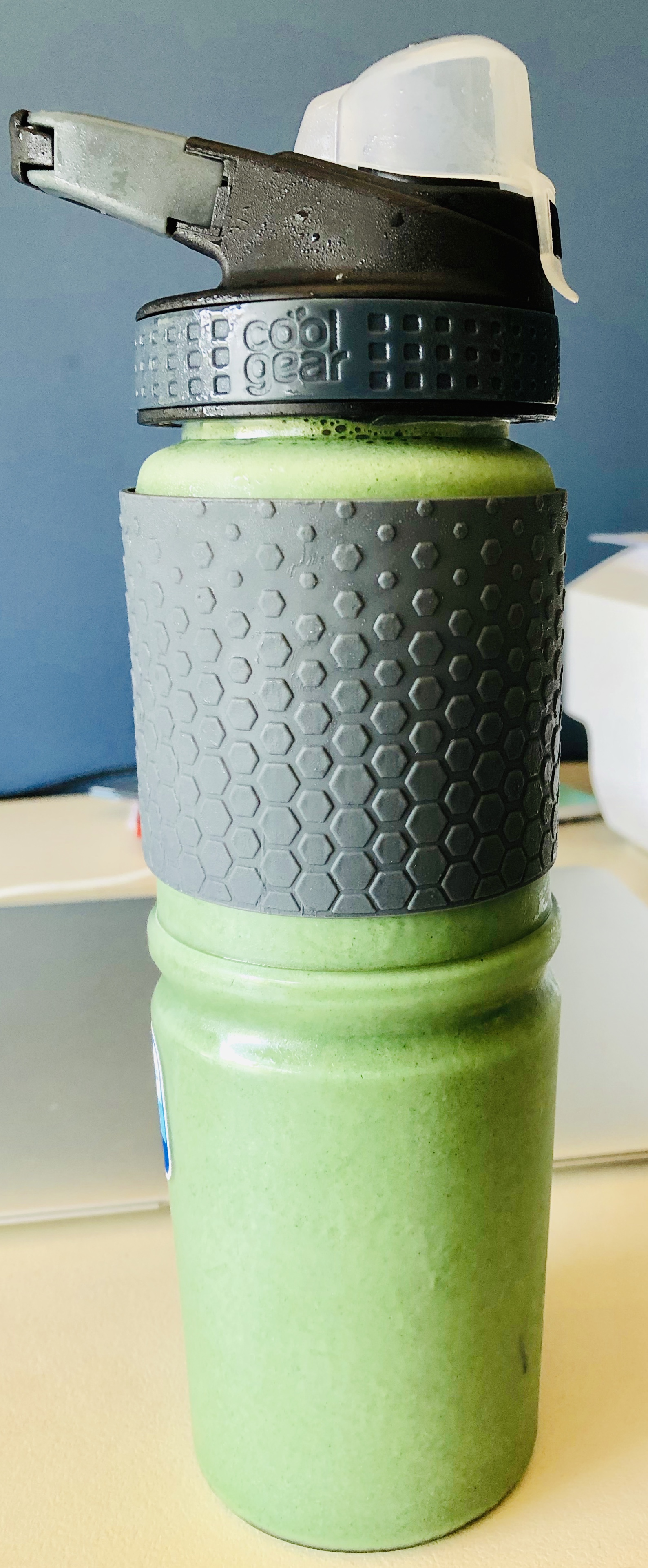 Unsweetened Almond Milk – Blueberries – Banana – Strawberries – crushed Nuts – 150 grams of yogurt – 1 Full table spoon of Super Greens – mixed well in the blender, followed by ice and pour.